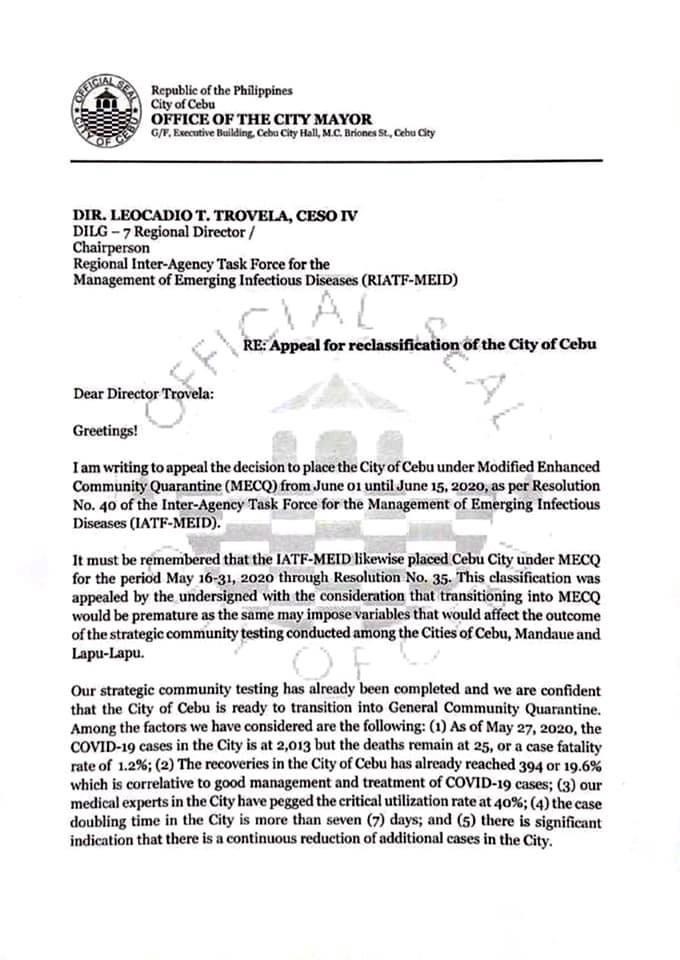 ざっくり言いますとと「セブシティ市長Edgardo Labellaはセブ市も6月1日からMECQではなくGCQへの移行を認めるようIATFに要望している」ようです。IATF宛に以下添付のオフィシャルレターを既に送っているようで、LabellaのFacebookページでそのレターは発表されています。