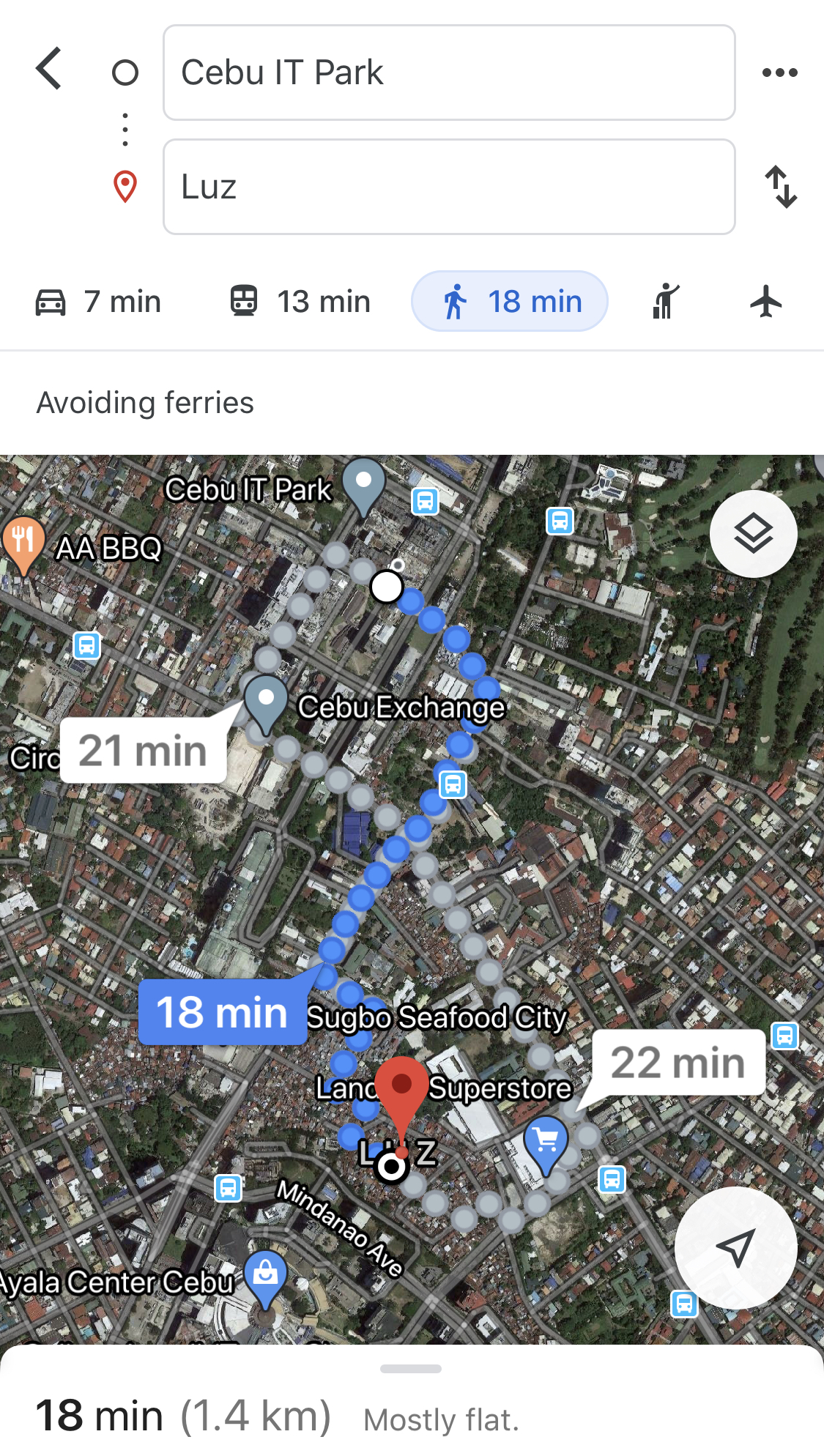 *上記画像はセブビジネスパーク&ITパーク中心地からLUZ中心地へのGoogleマップが算出した距離・移動見積もり時間です。