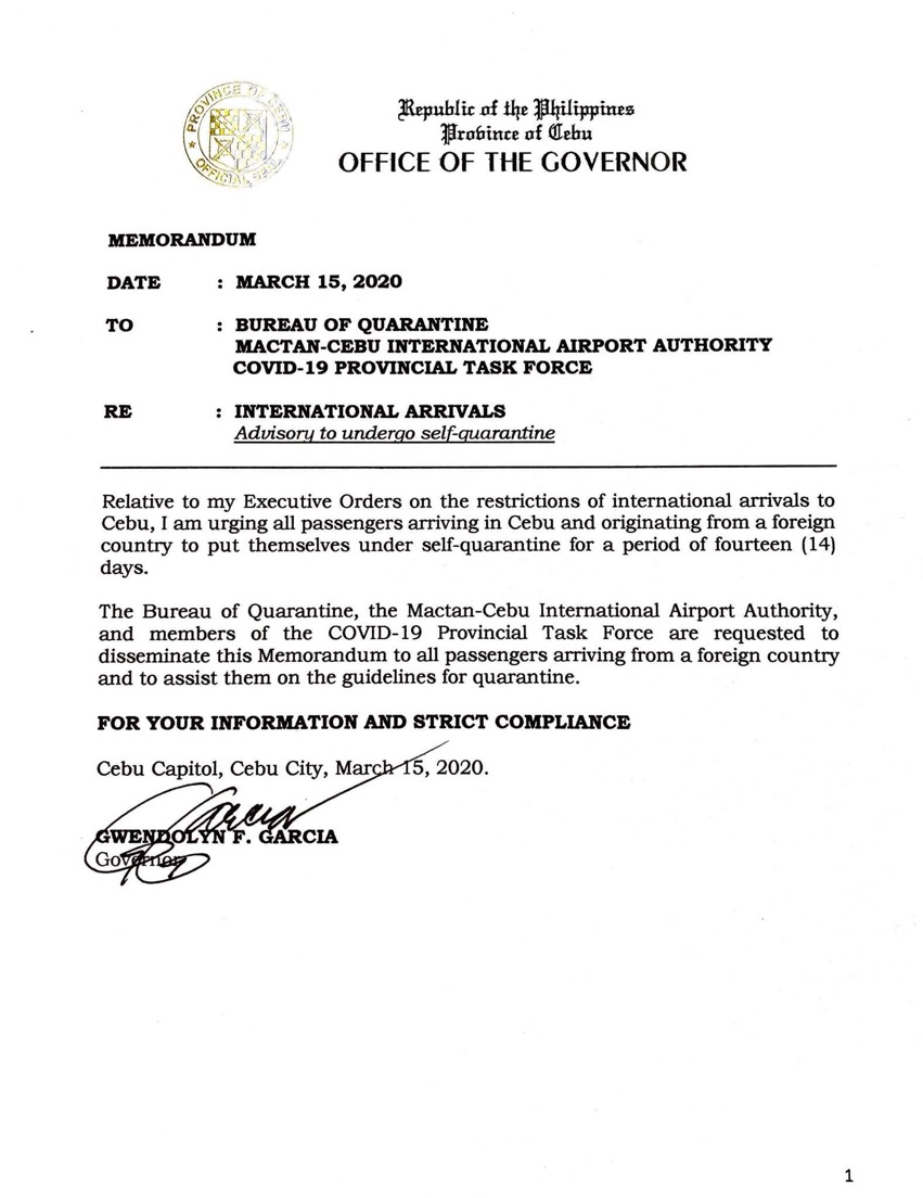 3月15日のタイミングでセブ州知事命令で3月17日より海外からのセブへの渡航者に対して「14日間の隔離」のルールが発表されました。これがどこまで厳密な隔離かは分かりかねますが、実質的な渡航制限と捉えてもよいかなと思います。