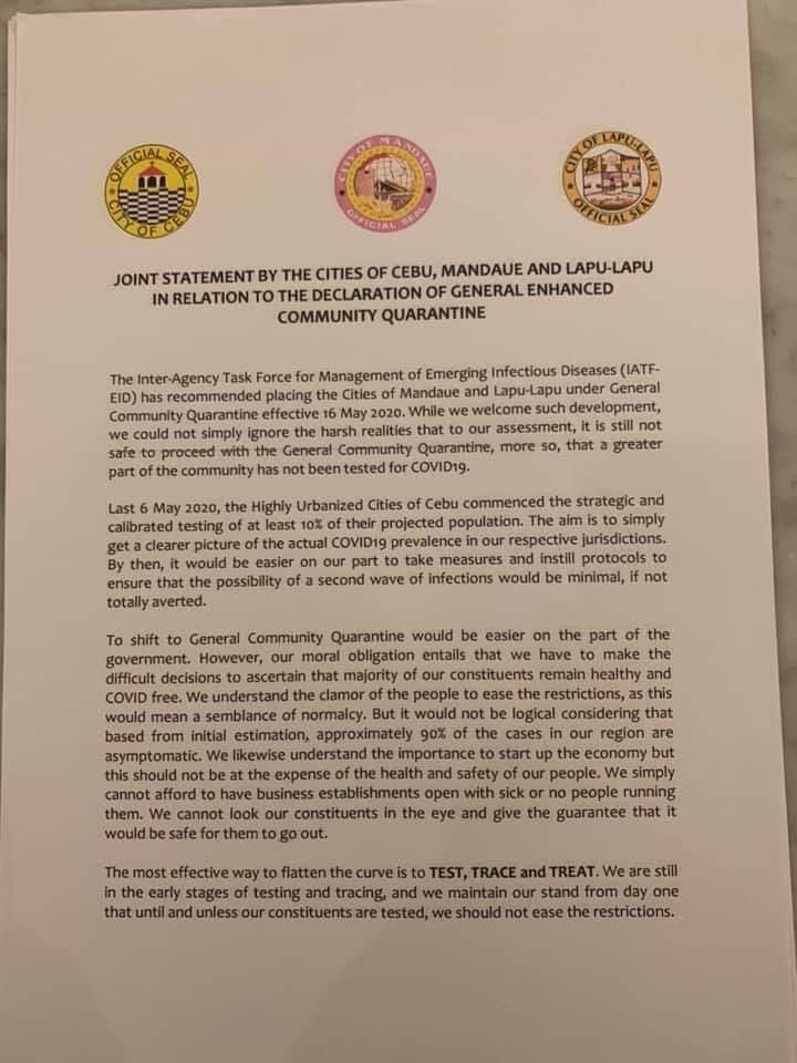 セブシティとマンダウエシティはMECQに移行ではなく、5月31日までのECQ期間延長が決定しました(以下添付)。ラプラプシティもECQ延長を希望しているようですが、現時点ではまだ延長許可が正式におりてないようで情報が錯綜しています。詳しくはこちら。