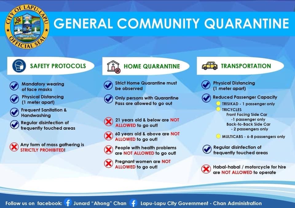 そんな状況のラプラプシティですが、General Community Quarantine (以下GCQ)に移行した場合のオリジナルガイドラインを市の公式Facebookページで発表いたしました。IATFがフィリピン全土を対象に発表しているGCQガイドラインより、更に厳しい規制をかけています。仮に「IATFがECQ延長を認めずGCQエリア扱いになっても、ラプラプ市は厳しく対応していきますよ」という意思表示にも見えますね!